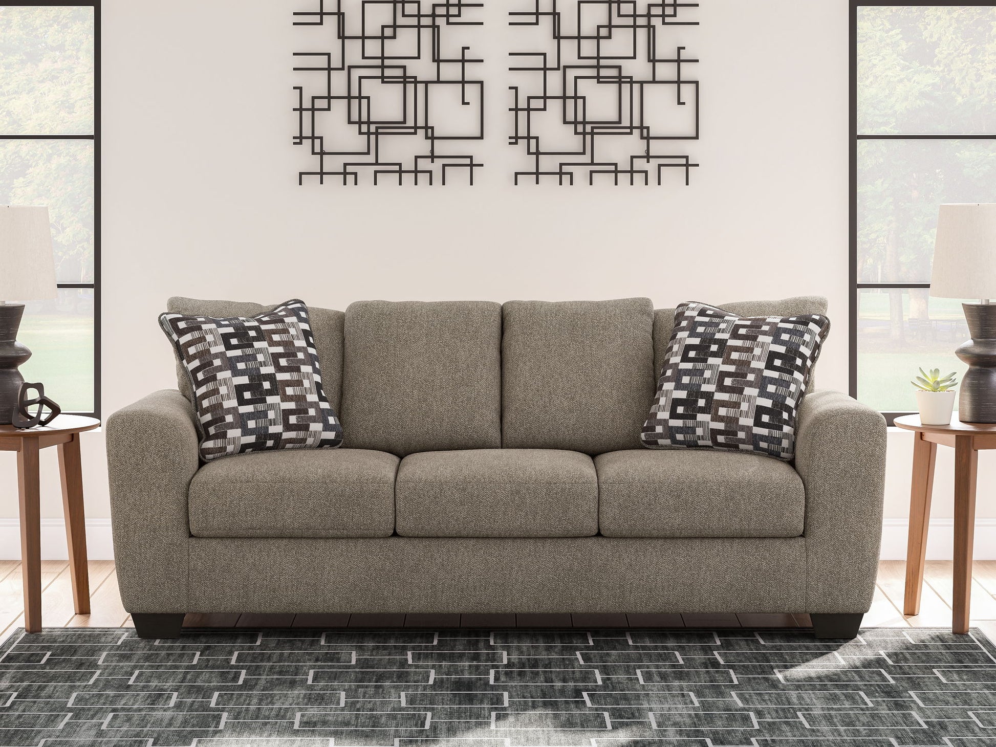 Transitional and right on trend. This sofa’s upholstery is a delightful change from the ordinary, with hints of soft brown giving the gray hue added depth. It’s punctuated with chic accent pillows in an eye-catching, stylized stripe design. Whether you're hosting friends and family or relaxing solo, this sofa invites homey, comfortable character into your space.
